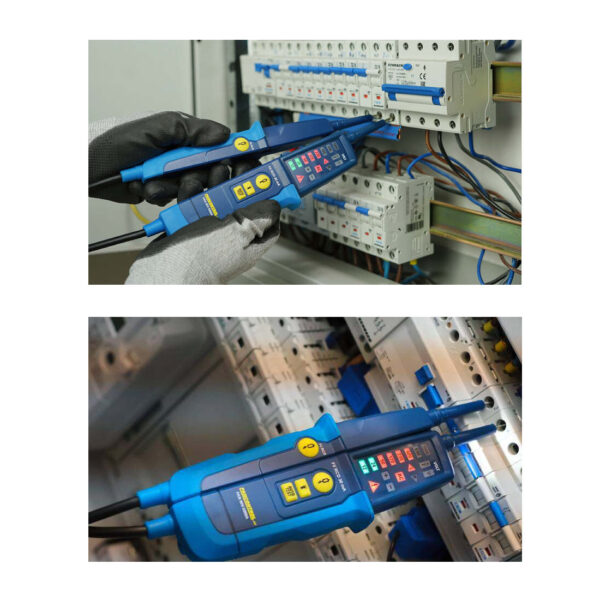 Nabízí automatické vypnutí, test FI 30mA a LED svítilnu. Odolná vůči prachu a stříkající vodě (IP64), testováno TÜV GS. Disponuje přepínatelnou zátěží pro eliminaci bludného napětí, akustickým alarmem pro 1pólový fázový test a 2pinovým displejem otočného pole. Indikace napětí: zelená pro nízké napětí (do 24 V), červená pro nebezpečné napětí (od 50 V). Součástí jsou šroubovací kontaktní dutinky pro zásuvky a návod.